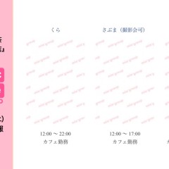| 営業時間 | 12:00〜22:00(最終受付21:20) 定休日 不定休 深夜営業については、公式ページ右上の深夜営業日案内を ご覧ください(金曜・土曜日を中心に深夜営業予定)。 深夜営業対象日 22:00〜翌朝5:00(最終受付 翌朝4:20) http://market.chu.jp/schedule1/sche37.cgi ミアグループ総合スケジュール(PC&スマホ) http://market.chu.jp/schedule1/sche37.cgi?dm=1 ミアグループ総合スケジュール(ガラケー) 告知日のみ営業となります。告知日以外は深夜営業いたしておりません。 | ||||||||||||||