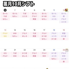 #Bar黒月 10月シフト最新版🐈‍⬛ イベント予定✨️ 12(日)るいん卒業&アルナ総長就任式💐 26(日)ユリカ生誕祭🎂 31(金)ハロウィン🎃 営業時間 🩷19時~23時 💜18時~23時 💛18時~22時 #黒月お給仕 https://t.co/T1FSjGI5Kh