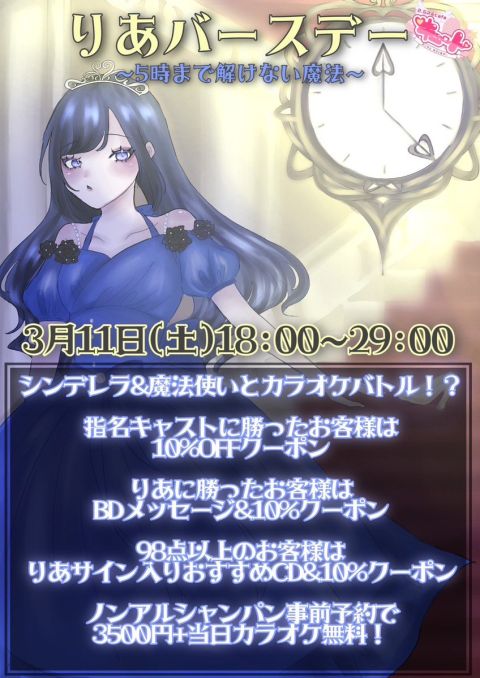 ✨本日のキュート✨ 18:00〜りあ 18:00〜さと 19:00〜あやね 🌟イベント🌟 3/11 🎂りあリアルBD 当日カラオケ無料+ノンアルスパークリング事前予約受付中🥂 営業時間 18:00〜24:00 https://t.co/3AzlkyLgNq