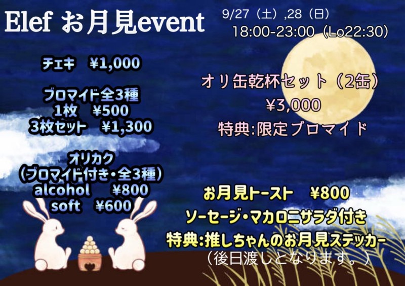 9/27(土) 〜本日のElef〜 お月芋event🌕🐇 Bar time OPEN18:00 CLOSE 23:00Lo22:30 もも@_momelody めい@ME1_chaaan うに@unitensi るあち@ruachi_Elef 桔梗@l7o3c さの@_SmaIIFry あんり@xr_l0chu 皆様のご来店 心よりお埅ちしおたす 近日むベント予定 9/27,28 お月芋event https://t.co/8p90NeVgq6