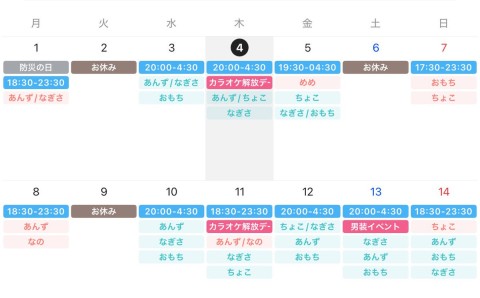 | 営業時間 | 月〜木18:00~23:30 金18:00~5:00 土17:00~5:00 日17:00~23:30 | ||||||||||||||