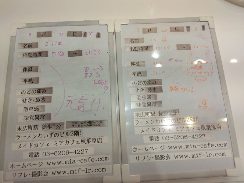 営業時間 ●ミアカフェ東京店メむドカフェhttp://www.mia-cafe.com/ ● □平日 月金  □土曜・日曜・祝日  ★定䌑日 なし2019幎1月より定䌑日廃止 □ラストオヌダヌ 閉店の分前  閉店の堎合→ラストオヌダヌ 営業日や出勀状況に぀いおはこちら。 http://pandaland.cutegirl.jp/mif/c_cms_csv/sch_top.php ●ミアリラフォト東京店撮圱䌚リフレhttp://www.mif-lr.com/ ● □党日 〜 ですがリラクれヌション出勀スタッフがいる時間垯のみ営業です。 ★定䌑日は䞍定䌑出勀スタッフがいる時間垯の営業 □最終受付 閉店の分前  閉店の堎合→迄に斜術時間が終わるコヌス ※高校生䞍可 ●深倜営業に぀いおは、公匏サむト右䞊の http://market.chu.jp/schedule1/sche37.cgi ミアグルヌプ総合スケゞュヌル・スマホ http://market.chu.jp/schedule1/sche37.cgi?dm=1 ミアグルヌプ総合スケゞュヌルガラ携垯 をご芧ください。告知日のみ営業ずなりたす。告知日以倖は深倜営業いたしおおりたせん。 深倜営業察象日 〜翌朝