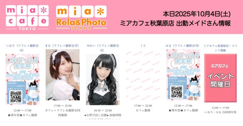 | å¶æ¥æé | âãã¢ã«ãã§æ±äº¬åºïŒã¡ã€ãã«ãã§ïŒhttp://www.mia-cafe.com/ãâ â¡å¹³æ¥ãæïœéãïŒïŒïŒïŒïŒïœïŒïŒïŒïŒïŒ â¡åæã»æ¥æã»ç¥æ¥ãïŒïŒïŒïŒïŒïœïŒïŒïŒïŒïŒ â å®äŒæ¥ããªãïŒ2019幎1æããå®äŒæ¥å»æ¢ïŒ â¡ã©ã¹ããªãŒããŒãéåºã®ïŒïŒåå ãïŒïŒïŒïŒïŒéåºã®å ŽåâïŒïŒïŒïŒïŒã©ã¹ããªãŒããŒ å¶æ¥æ¥ãåºå€ç¶æ³ã«ã€ããŠã¯ãã¡ãã http://pandaland.cutegirl.jp/mif/c_cms_csv/sch_top.php âãã¢ãªã©ïŒãã©ãæ±äº¬åºïŒæ®åœ±äŒïŒãªãã¬ïŒhttp://www.mif-lr.com/ãâ â¡å šæ¥ãïŒïŒïŒïŒïŒãïŒïŒïŒïŒïŒãã§ãããªã©ã¯ãŒãŒã·ã§ã³åºå€ã¹ã¿ãããããæé垯ã®ã¿å¶æ¥ã§ãã â å®äŒæ¥ã¯äžå®äŒïŒåºå€ã¹ã¿ãããããæé垯ã®å¶æ¥ïŒ â¡æçµåä»ãéåºã®ïŒïŒåå ãïŒïŒïŒïŒïŒéåºã®å ŽåâïŒïŒïŒïŒïŒïŒïŒïŒïŒïŒïŒè¿ã«æœè¡æéãçµããã³ãŒã¹ïŒ â»é«æ ¡çäžå¯ âæ·±å€å¶æ¥ã«ã€ããŠã¯ãå ¬åŒãµã€ãå³äžã® http://market.chu.jp/schedule1/sche37.cgi ãã¢ã°ã«ãŒãç·åã¹ã±ãžã¥ãŒã«ïŒïŒ°ïŒ£ã»ã¹ããïŒ http://market.chu.jp/schedule1/sche37.cgi?dm=1 ãã¢ã°ã«ãŒãç·åã¹ã±ãžã¥ãŒã«ïŒã¬ã©æºåž¯ïŒ ãã芧ãã ãããåç¥æ¥ã®ã¿å¶æ¥ãšãªããŸããåç¥æ¥ä»¥å€ã¯æ·±å€å¶æ¥ããããŠãããŸããã æ·±å€å¶æ¥å¯Ÿè±¡æ¥ãïŒïŒïŒïŒïŒãç¿æïŒïŒïŒïŒïŒïŒ¬ïŒïŒ¯ïŒïŒïŒïŒïŒïŒ | ||||||||||||||