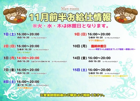 âšïž2025幎11æ1æ¥ïœ15æ¥ å¶æ¥æ¥ïŒã¡ã€ããçµŠä»æ