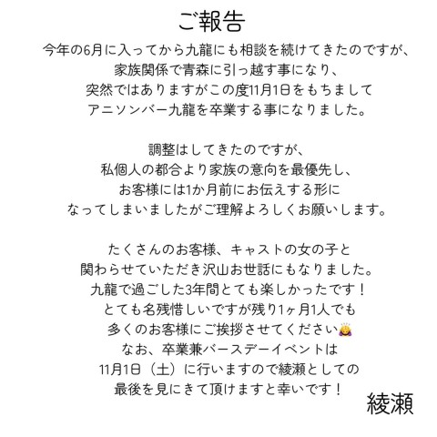 䞭目黒アニ゜ンバヌ九韍です 11月1日の土曜日 ★綟瀬九韍卒業Birthday なんるべくず方蚀誀字です Tシャツ特兞付きシャンパンのみ、早めにご予玄よろしくお願い臎したす🐌 #アニメ #アニ゜ン #アニ゜ンバヌ #䞭目黒 #メむド #コスプレ #カラオケ https://t.co/Ddj7U4x2bf