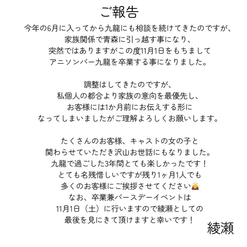 䞭目黒アニ゜ンバヌ九韍です 本日の朚曜日19時0時 副店長じゅんちゃん(19時30分) 綟瀬(23時30分) あたい(23時30分) 綟瀬ラスト2日 11月1日の土曜日 ★綟瀬九韍卒業Birthday★ 埅っおたす🐌 #アニメ #アニ゜ン #アニ゜ンバヌ #䞭目黒 #メむド #コスプレ #カラオケ https://t.co/67rm0aYXP2