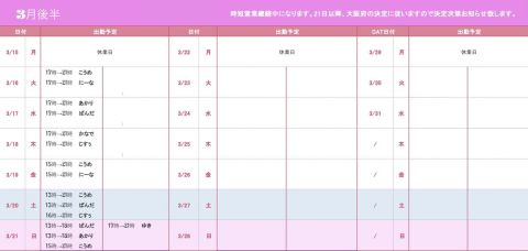 おはようございます!3月後半のシフトになります!21日以降に付きましては大阪府の決定に従いますので営業時間シフト共に確定次第お知らせいたします。皆様にはご迷惑をお掛けいたしますが今暫くお待ちください🙇♀️ https://t.co/xpfYc8GbGb
