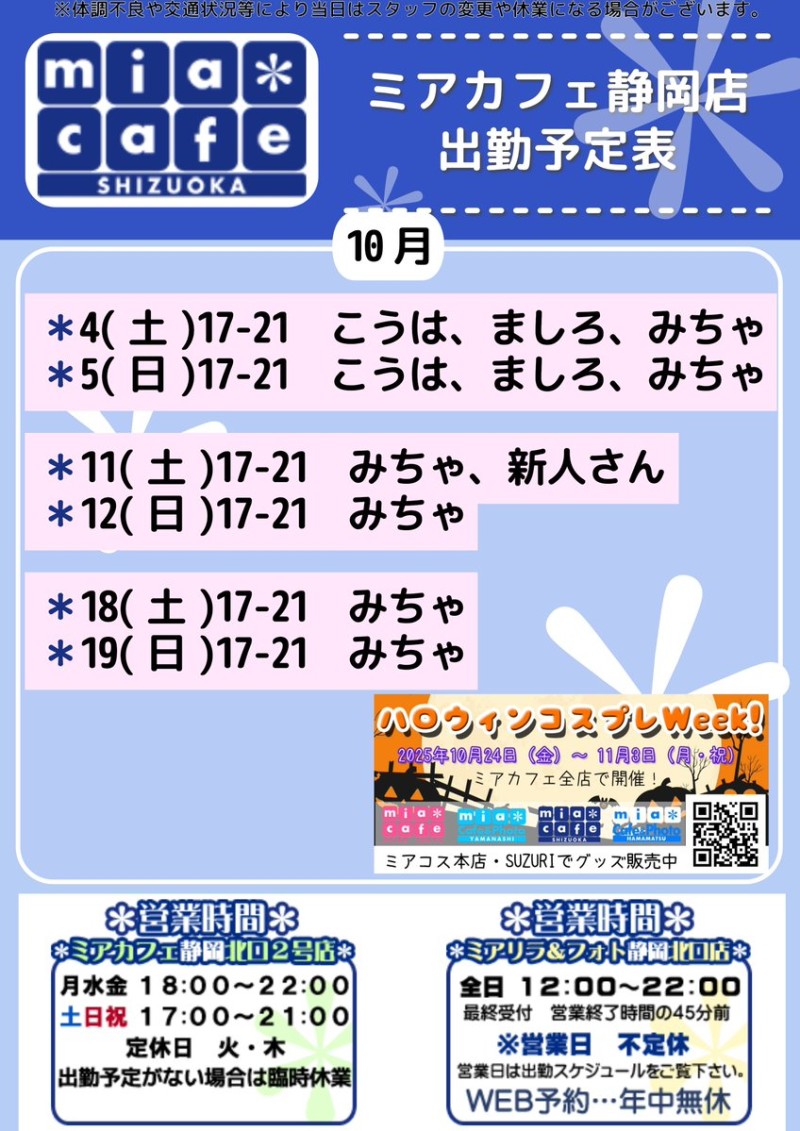 | 営業時間 | 静岡店は出勤スタッフがいれば営業です! 基本的に 12時~22時が営業時間です! ●静岡店のツイッター @shizuokamaidsan https://twitter.com/shizuokamaidsan ●ミア静岡店の営業曜日&営業時間● ☆月〜木 14:00〜22:00(最終受付20:00) ☆金曜日 12:00〜22:00(最終受付21:00) ☆土・日・祝 12:00〜22:00(最終受付21:00) 営業時間外はオンライン予約にてお願いいたします。 PC・携帯共通 → http://m-kanzume.moo.jp/yoyaku2/user.cgi ●ミアガイド出勤状況● スマホ・PC → 後日公開予定 ★静岡店スタッフによるミア甲府店でのメイドカフェリアル営業★ ☆不定期 サイトにてご確認ください。 http://market.chu.jp/schedule1/sche37.cgi | ||||||||||||||