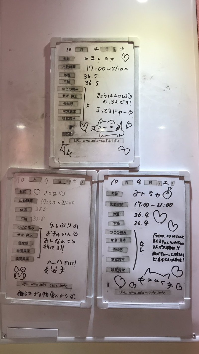 | 営業時間 | 静岡店は出勤スタッフがいれば営業です! 基本的に 12時~22時が営業時間です! ●静岡店のツイッター @shizuokamaidsan https://twitter.com/shizuokamaidsan ●ミア静岡店の営業曜日&営業時間● ☆月〜木 14:00〜22:00(最終受付20:00) ☆金曜日 12:00〜22:00(最終受付21:00) ☆土・日・祝 12:00〜22:00(最終受付21:00) 営業時間外はオンライン予約にてお願いいたします。 PC・携帯共通 → http://m-kanzume.moo.jp/yoyaku2/user.cgi ●ミアガイド出勤状況● スマホ・PC → 後日公開予定 ★静岡店スタッフによるミア甲府店でのメイドカフェリアル営業★ ☆不定期 サイトにてご確認ください。 http://market.chu.jp/schedule1/sche37.cgi | ||||||||||||||