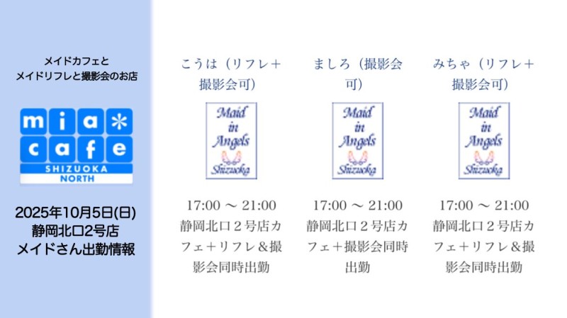 | 営業時間 | 静岡店は出勤スタッフがいれば営業です! 基本的に 12時~22時が営業時間です! ●静岡店のツイッター @shizuokamaidsan https://twitter.com/shizuokamaidsan ●ミア静岡店の営業曜日&営業時間● ☆月〜木 14:00〜22:00(最終受付20:00) ☆金曜日 12:00〜22:00(最終受付21:00) ☆土・日・祝 12:00〜22:00(最終受付21:00) 営業時間外はオンライン予約にてお願いいたします。 PC・携帯共通 → http://m-kanzume.moo.jp/yoyaku2/user.cgi ●ミアガイド出勤状況● スマホ・PC → 後日公開予定 ★静岡店スタッフによるミア甲府店でのメイドカフェリアル営業★ ☆不定期 サイトにてご確認ください。 http://market.chu.jp/schedule1/sche37.cgi | ||||||||||||||