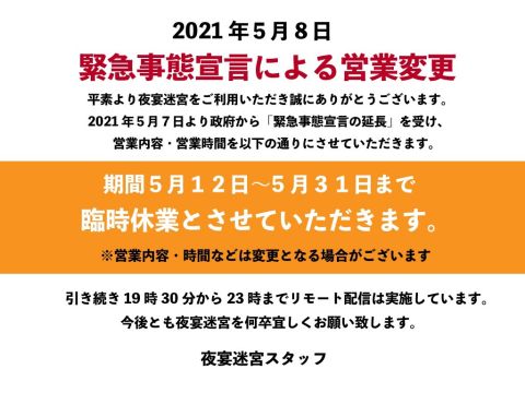 5月7日に政府から緊急事態宣言期間の延長を受けて、営業内容をご報告致します。